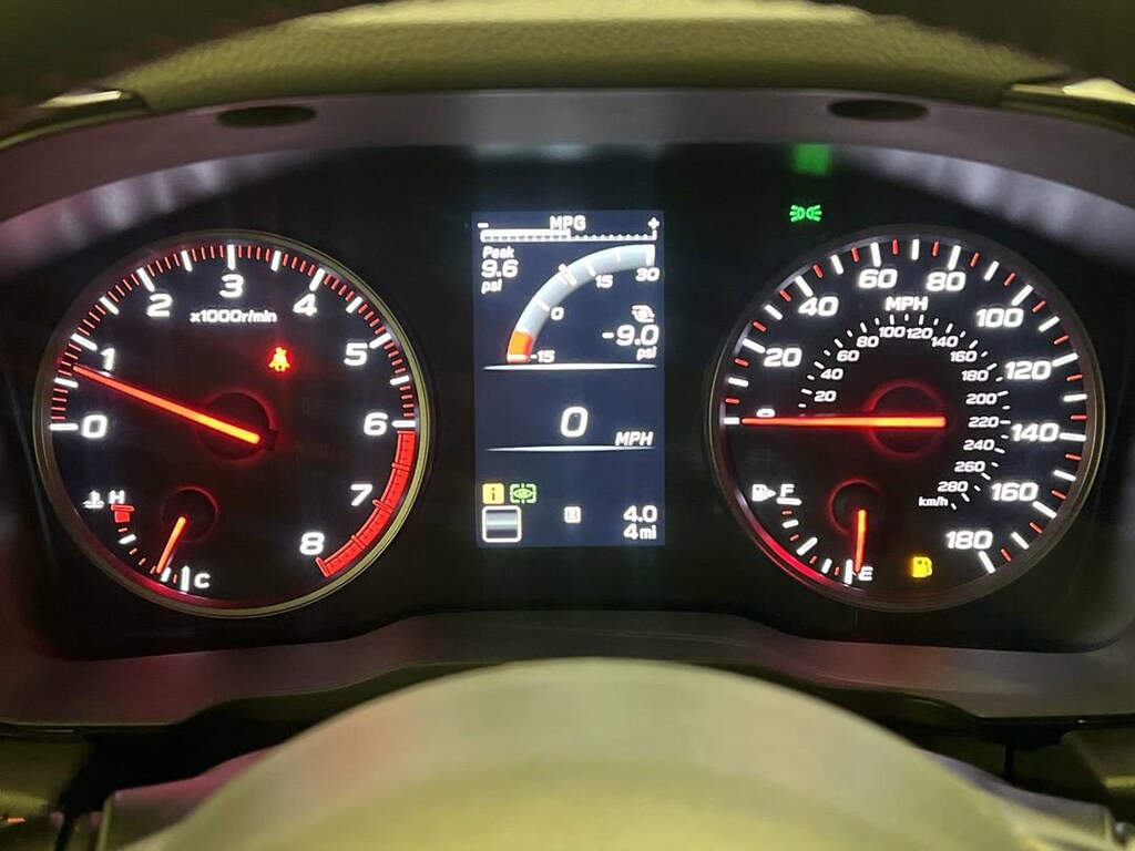 Moving on to more general interest items, shame on you, Subaru, for not giving us a boost gauge! I know where it should go, at the top of the panel between the analog gauges where the “mpg gauge” is now. I think the “mpg gauge” might actually be a vacuum gauge, so maybe it shows boost, but a direct calibration is necessary for any turbocharged engine. No one driving this kind of car cares about fuel consumption enough to look at the “mpg gauge.” There’s also a “cumulative mpg” readout that seems to be applied when you reset the trip odometer. This is somewhat useful and shows I’m getting about 28 mpg on the average, 31 highway, which for this lively a car is great! (Although, it’s premium fuel so it’s more expensive per gallon than most cars need).